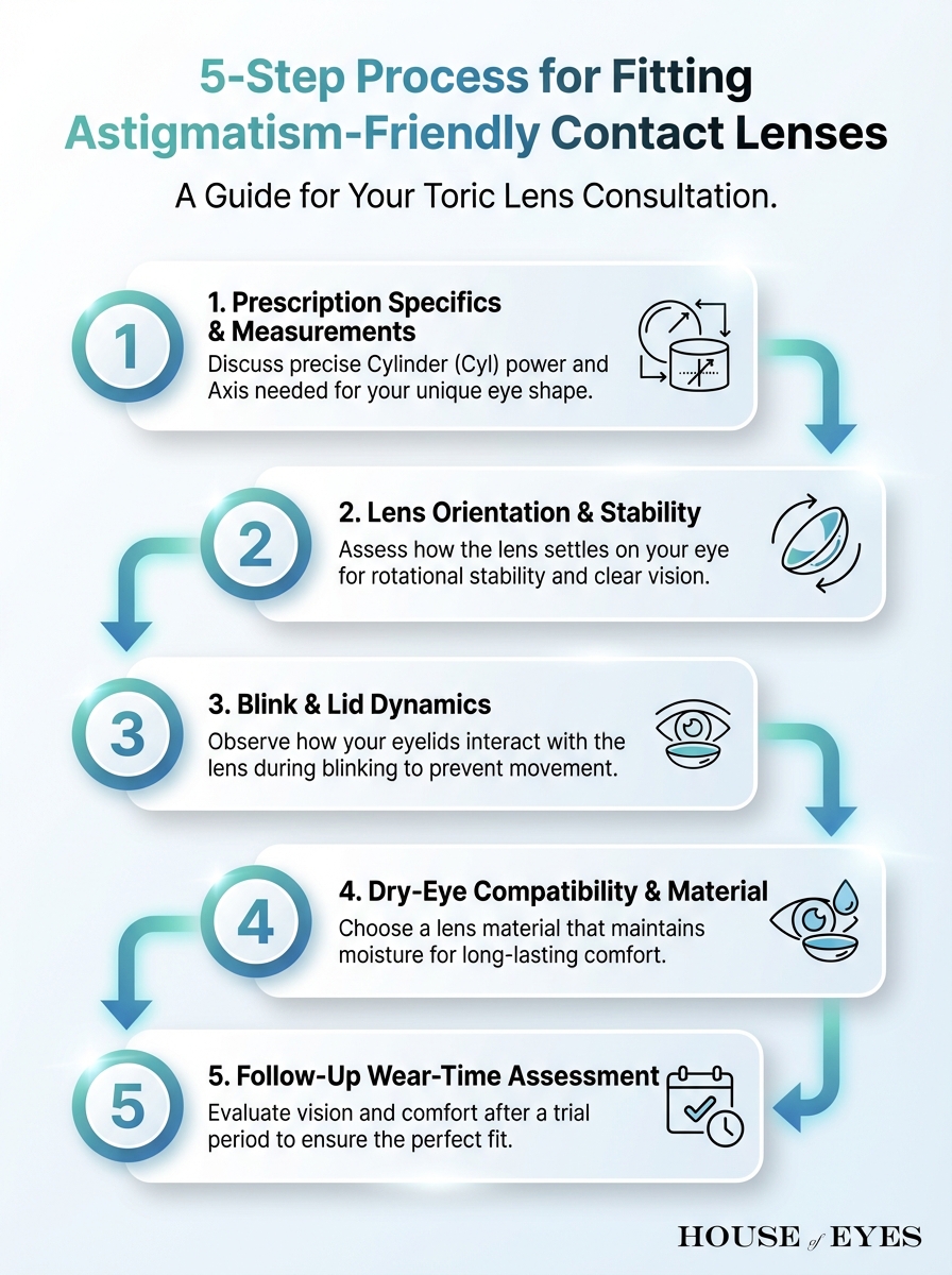 A concise five-step guide for fitting astigmatism-friendly contact lenses. Learn tips for comfort and clear vision.